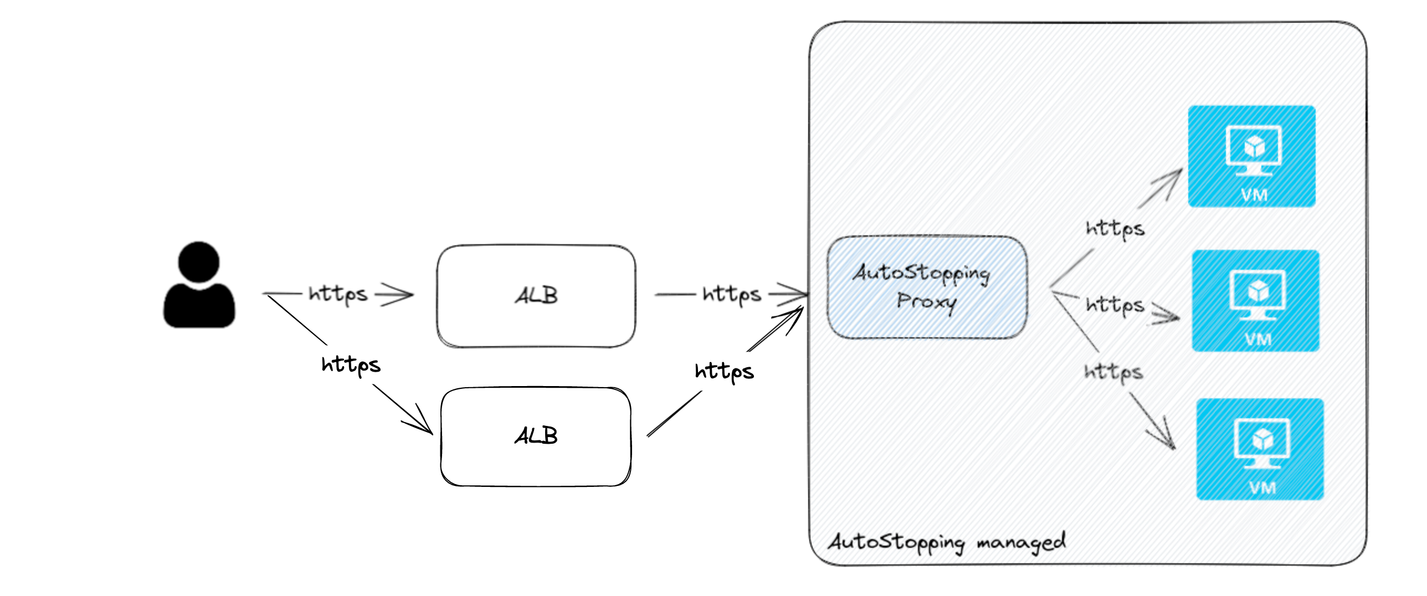 The AutoStopping Proxy can be used as a downstream system to existing ALB(s) in order to leverage dynamic idle-time detection required for AutoStopping of resources. This can be done for various types of load balancers. This would mean no changes to existing DNS mappings done on AWS ALB and involves easier configuration without any disruptions.