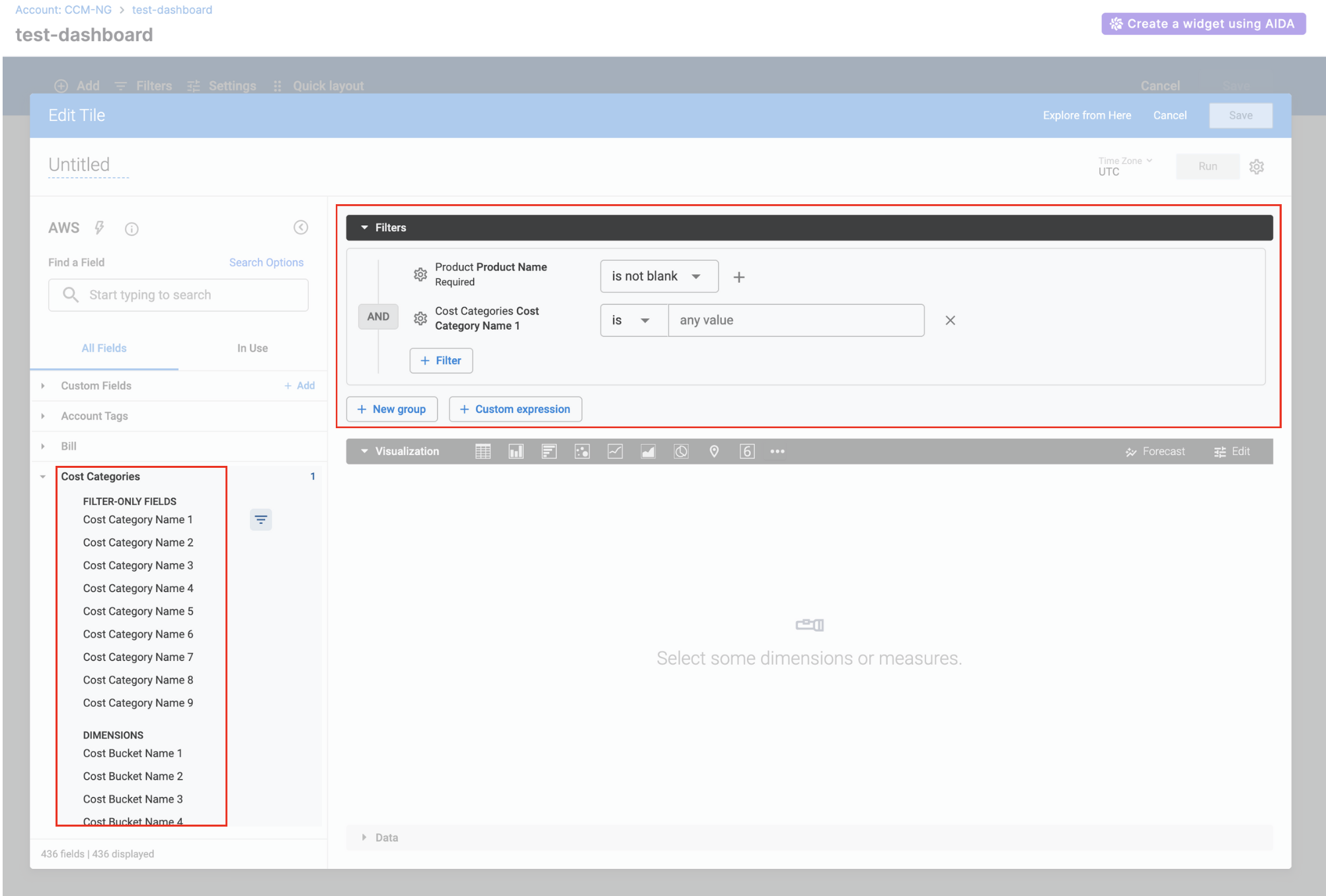 In AWS, you cannot use cost categories as a dimension in custom dashboards if you have selected any of the following fields in the explore: