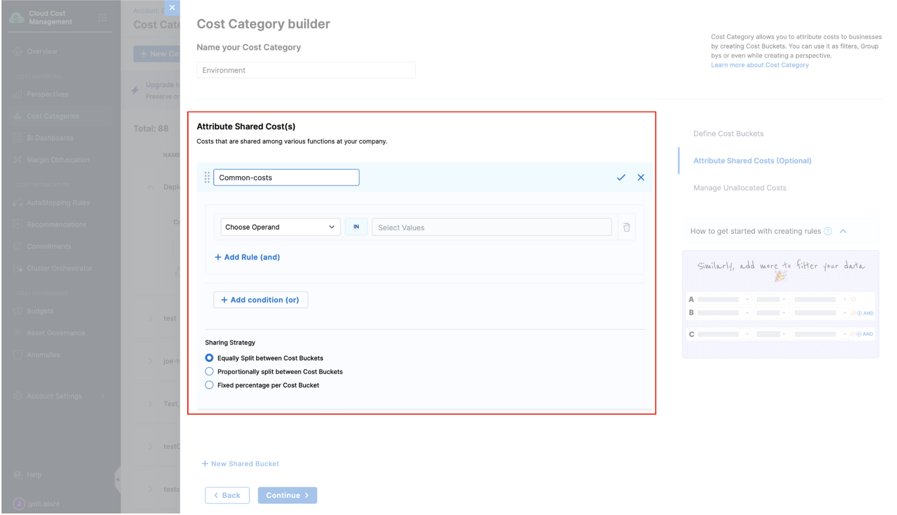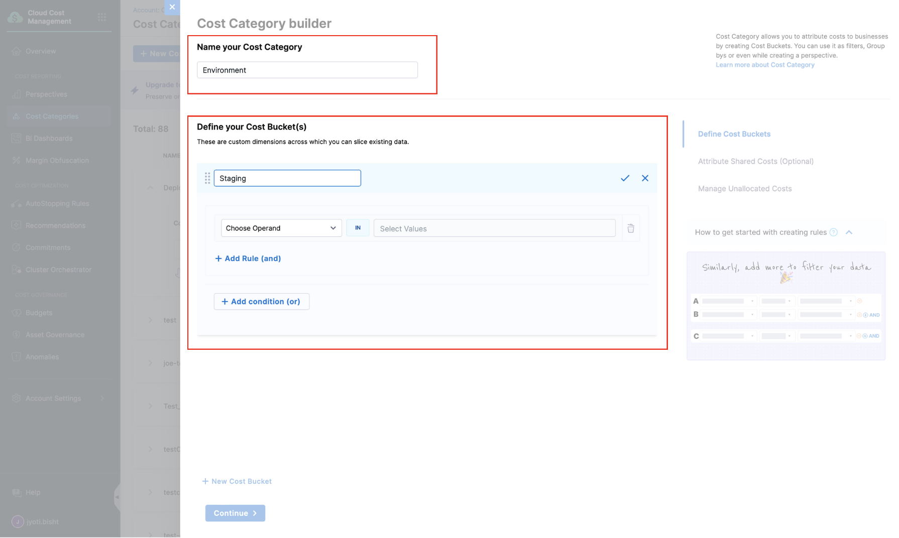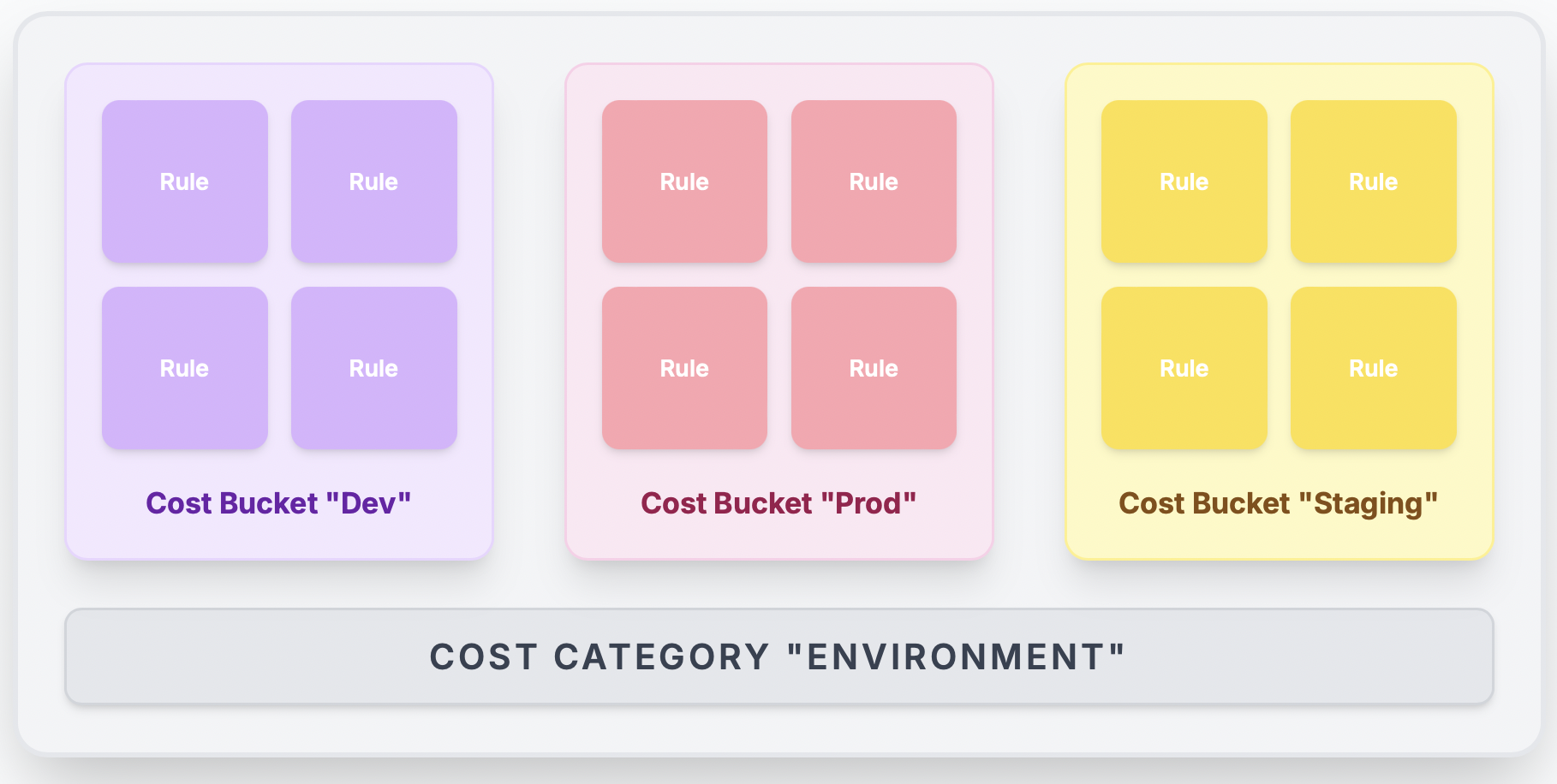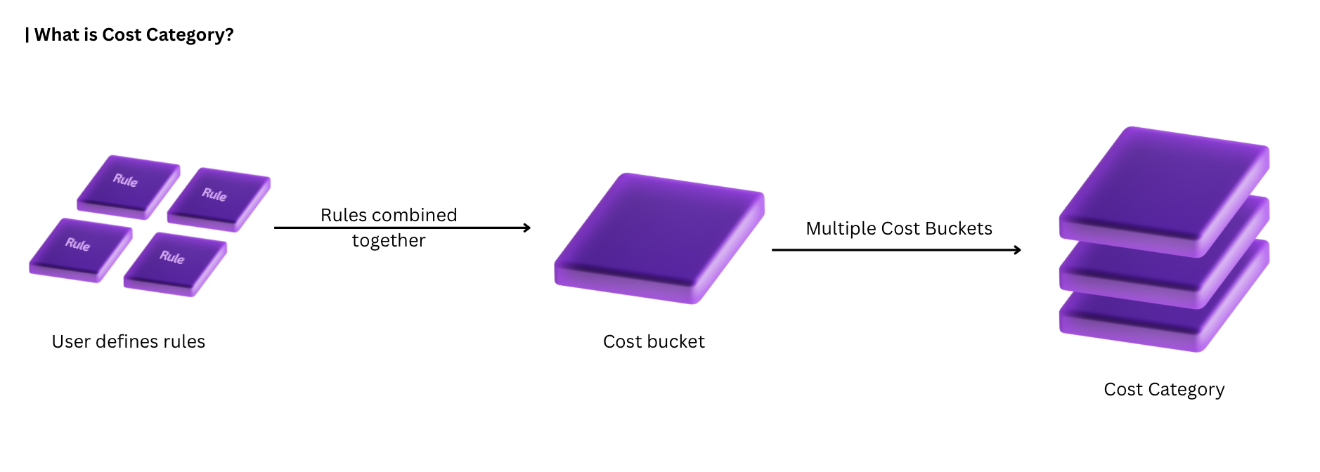 The logic behind cost categories is simple: Create Rules that bring in cost data -> Rules combine to form Cost Bucket -> Cost Buckets combine to form Cost Category