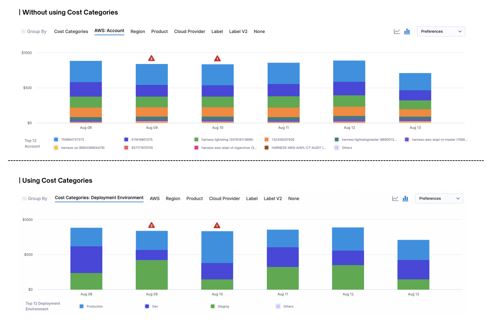 Without Cost Categories: Creating a Perspective to analyze costs by environment requires creating perspectives with multiple rules and any new account or tag variation means updating the Perspective again.