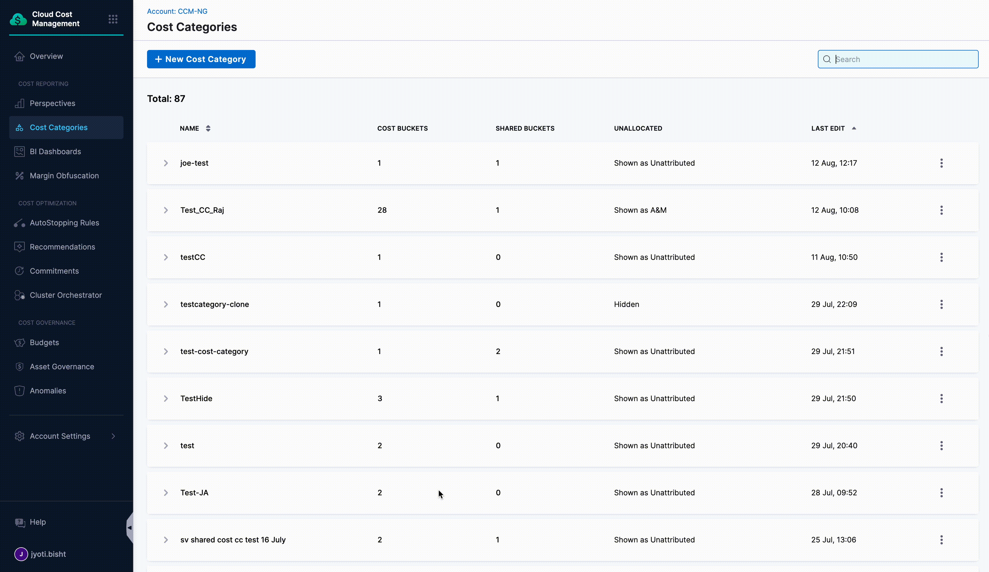 The Cost Categories overview page provides a centralized view of all your defined categories. From this dashboard, you can: