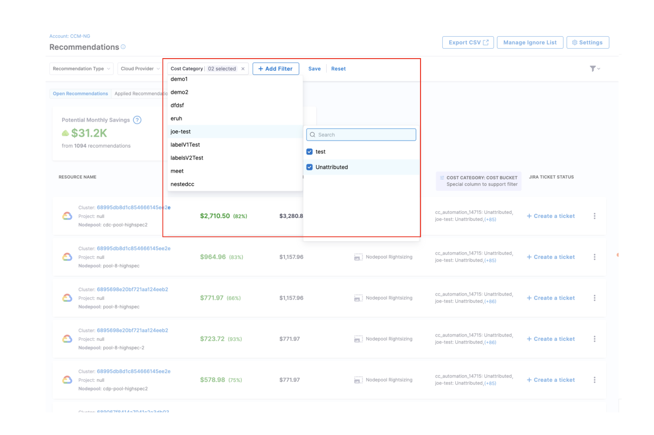 You can filter CCM Recommendations using Cost Categories to focus on specific business areas: