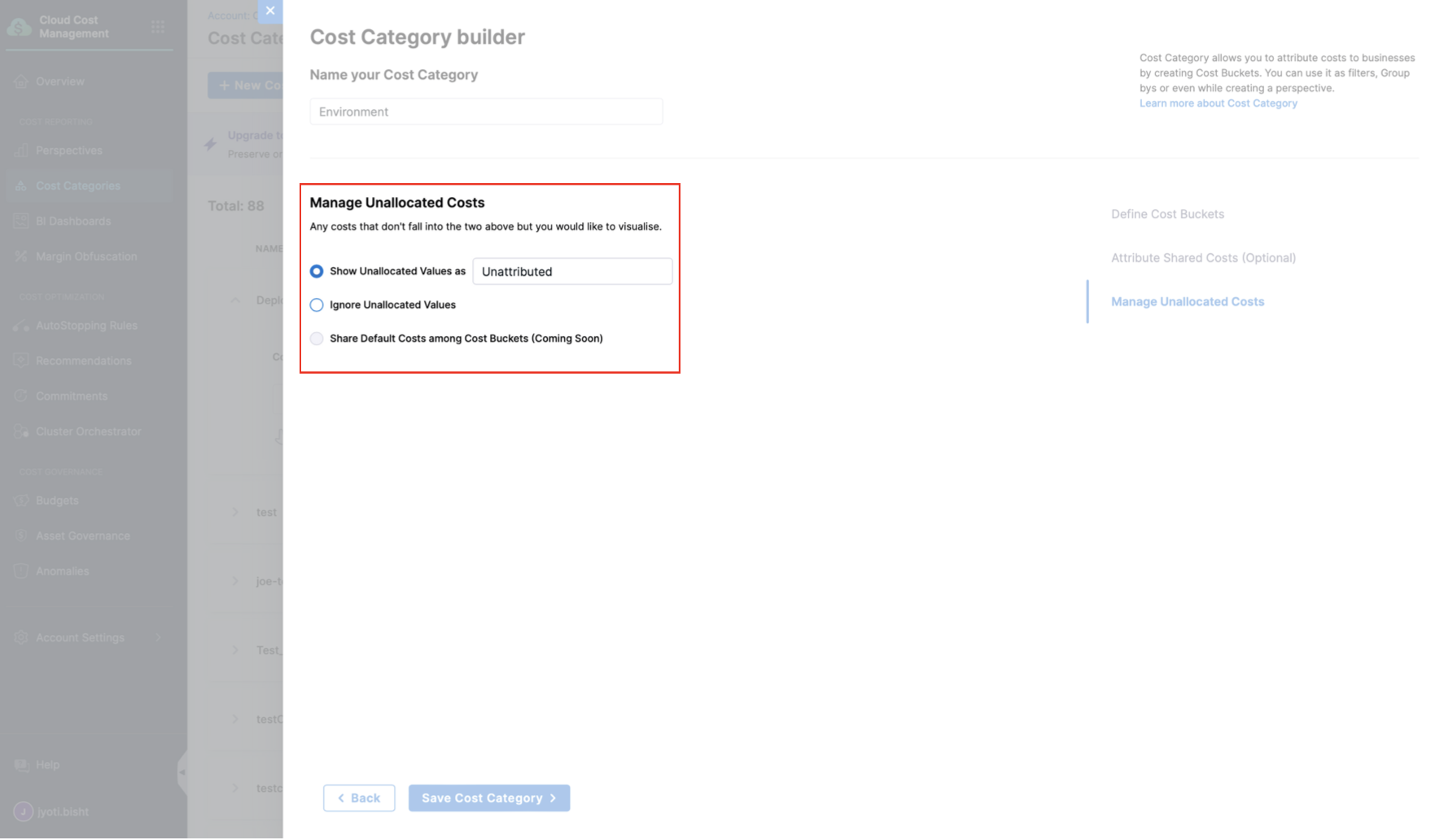 • View category details - Click any category to examine its cost buckets, rules, and configurations