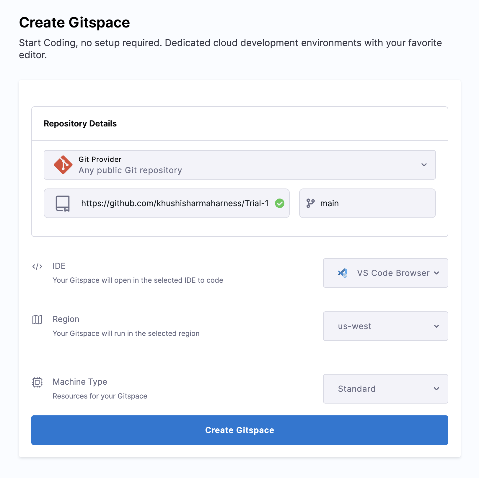 - Start by creating a new Gitspace from the Harness UI. (check the quickstart guide for more details) Please ensure that while creating one, you choose “VS Code Browser” as the selected IDE.