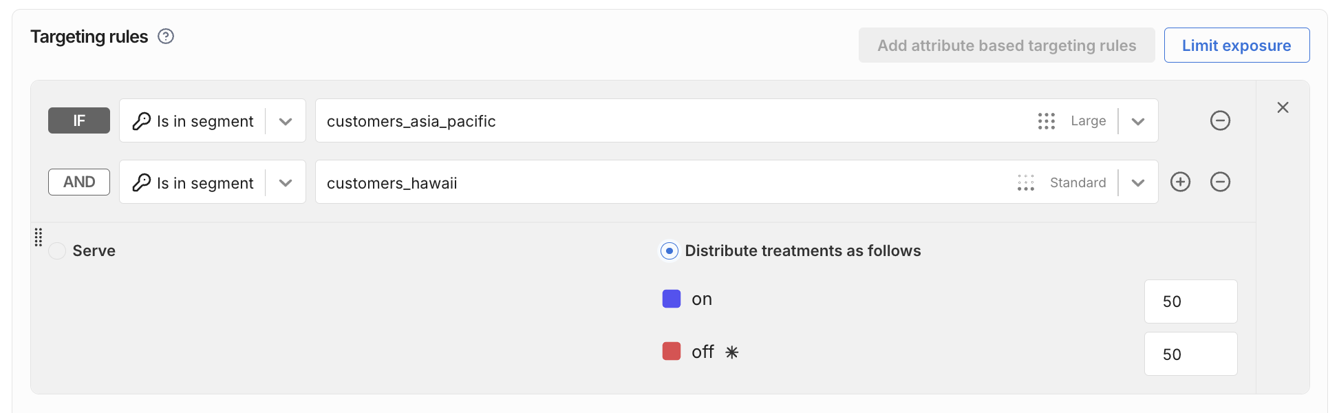 You can also target Standard, Large, and Rule-based segments in attribute based targeting rules. The following example is equivalent to the individual targeting rule shown above.