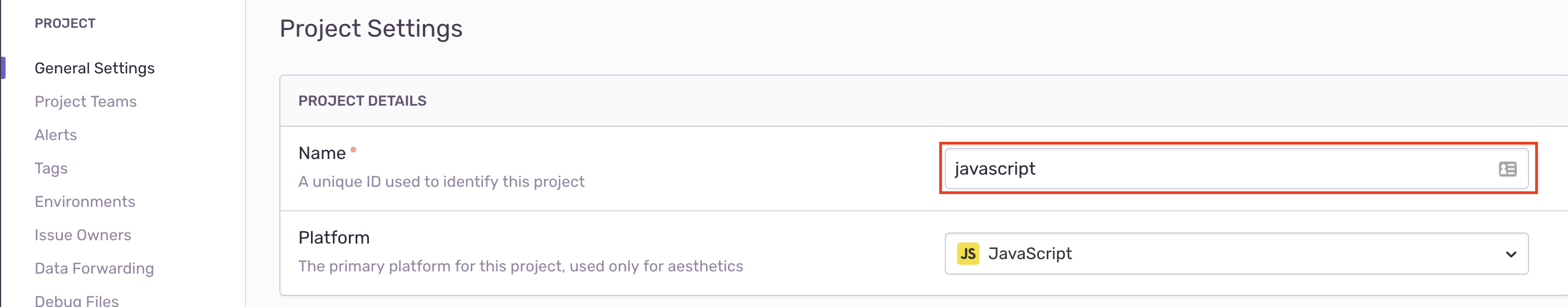 3. Copy your Sentry Project Slug. You can access this by clicking Settings in the left nav of your Sentry dashboard, then click Projects under the Organization section. Select your desired project from the list there and you can then grab the Project Slug from the General Settings section.