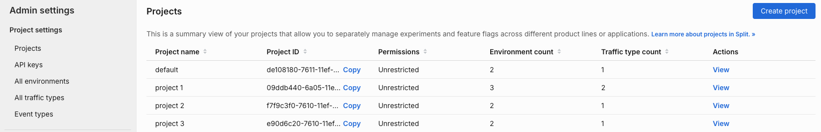 Projects allow you to separately manage your feature flags and experiments across your different business units, product lines, and applications. When you first create your account, you're provided with one project named Default.