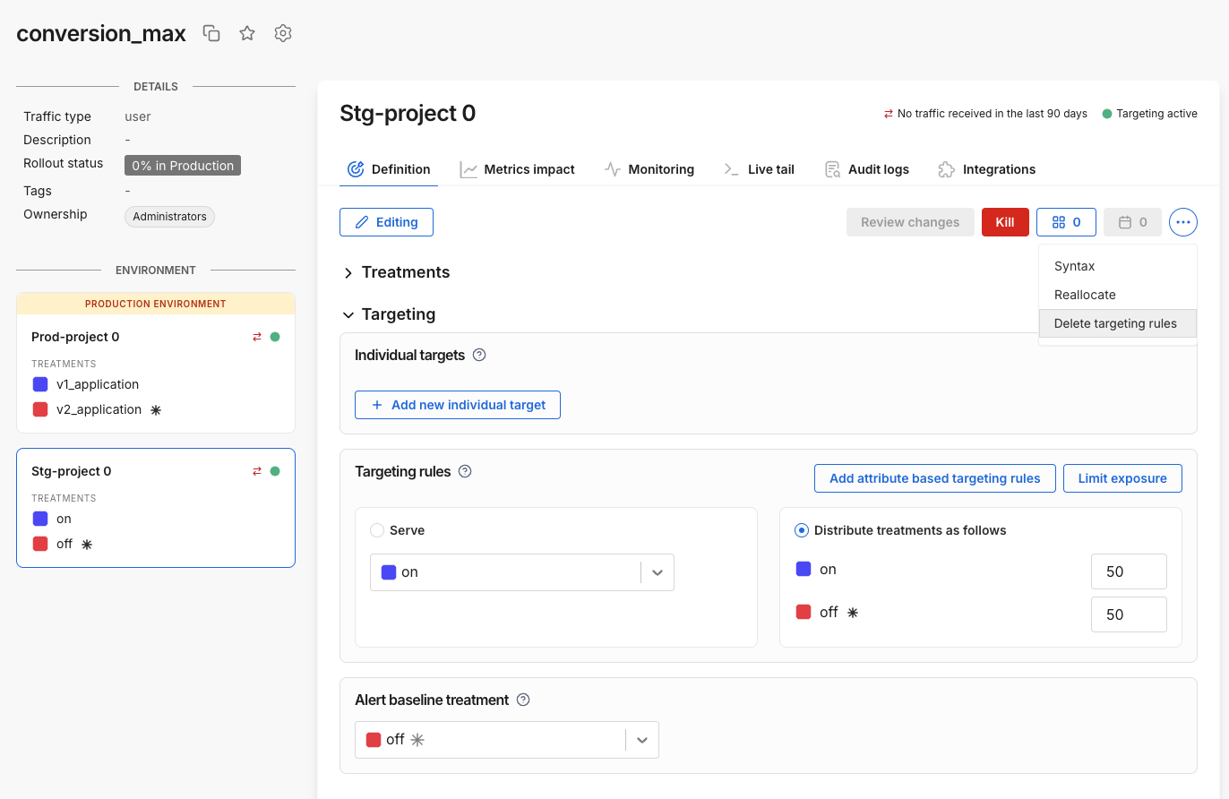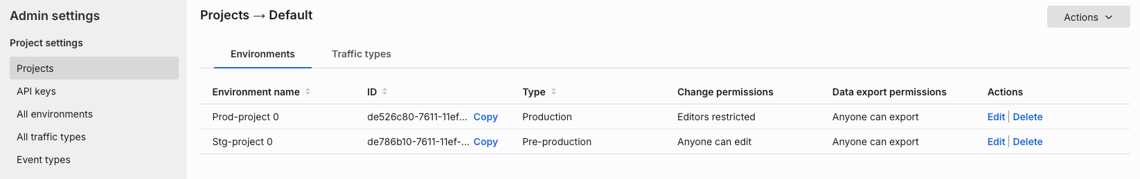 This project has two environments and one traffic type created underneath it. You can rename and edit these environments and traffic types and add more to the Default project.