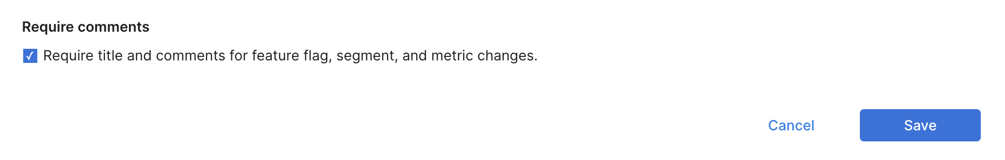 6. Enable the Require comments toggle to enforce titles and comments for changes to feature flags, segments, and metric.