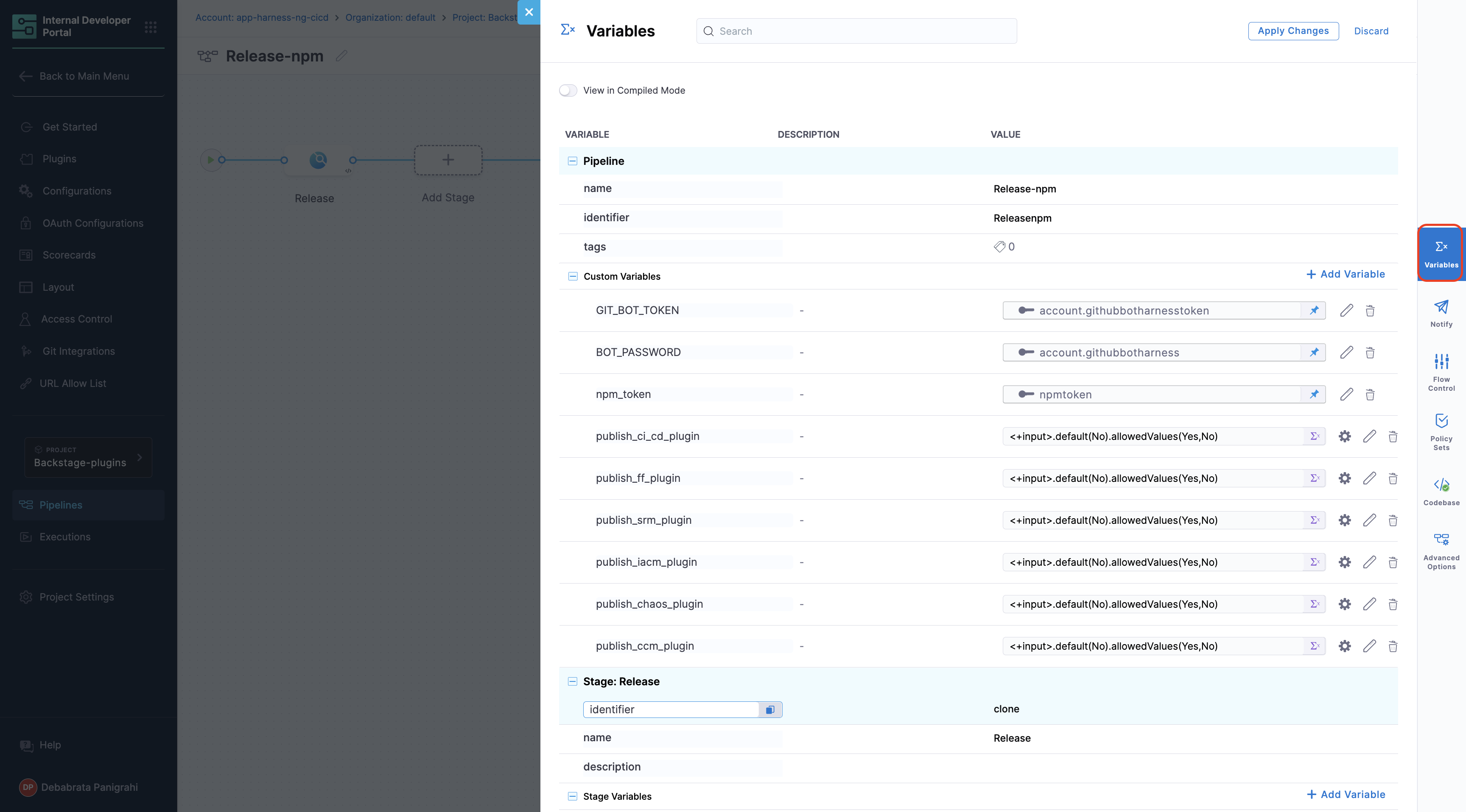 Before adding the execution steps, we need to create some pipeline variables with runtime inputs, which will be used as expression inputs in various steps during execution.
