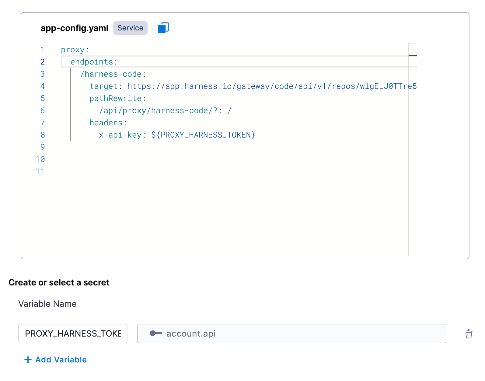 We will need to create a variable below called PROXY_HARNESS_TOKEN and select the Harness account secret that holds the value. This needs to be a Harness API key with read access to Code repos, preferably from a service account, that can resolve files from your target repositories.