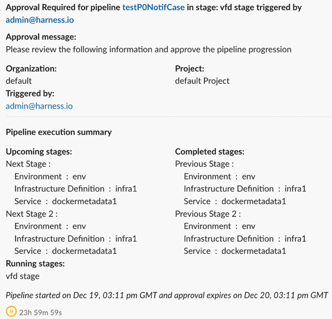 Approval Required: A notification is sent when the approval step starts containing the pipeline name, execution URL, user who triggered the pipeline, stage name, approval message, organization and project details, pipeline start time, and the time left in approval expiry.