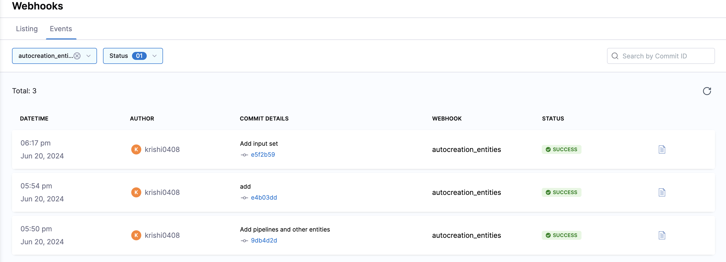 • Register the webhook for your repository where you are adding your files remotely. The scope of the webhook should match the entity it's trying to create. For example, a project-level webhook can only create entities within the same project, whereas an account-level webhook can create entities across multiple projects and the organizations.