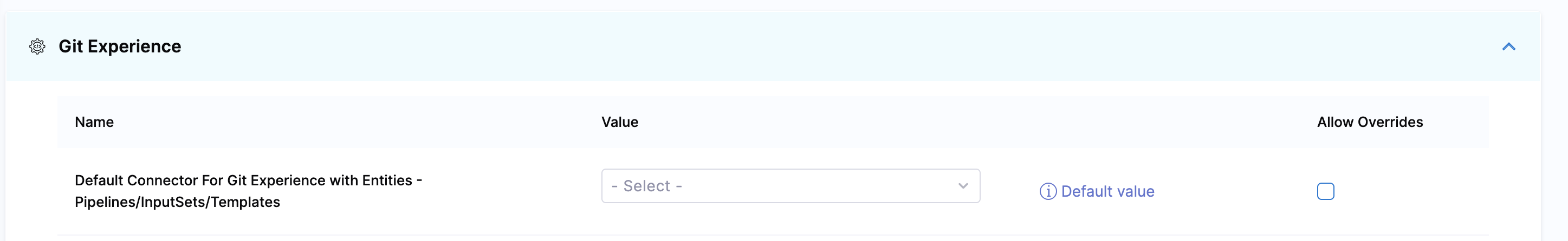 To avoid selecting the same connector repeatedly, you can enable the default connector settings Default Connector For Git Experience with Entities - Pipelines/InputSets/Templates. When this setting is enabled, the default connector is preselected during pipeline or template creation. You can, however, use any other connector if necessary.