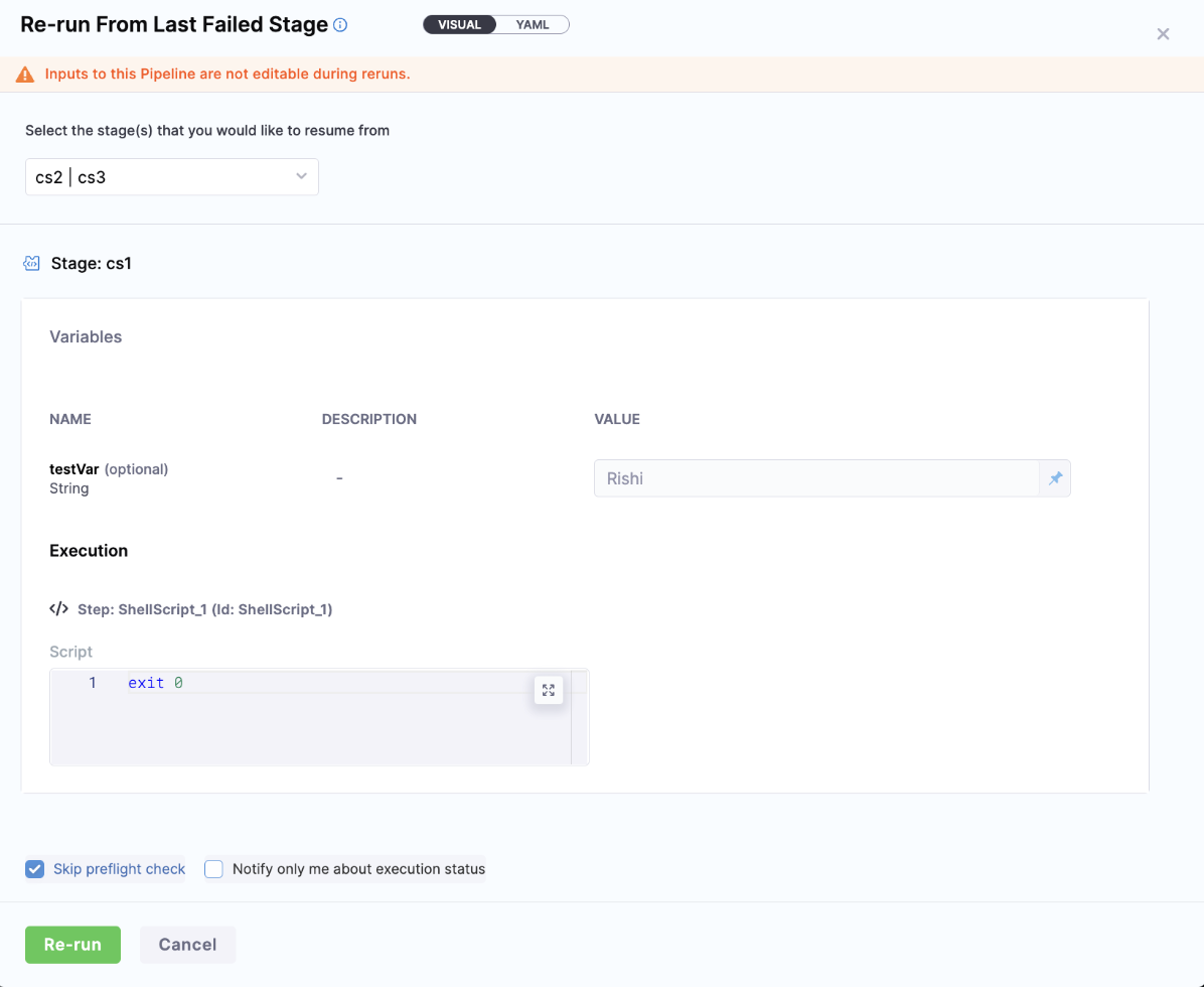 When the above setting is enabled, the API call to Re-run the pipeline ignores any inputs provided. Normally, on re-runs, the inputs are sent again in the API call. However, with this setting enabled, even if inputs are provided, they will be ignored, and the inputs from the original execution will be used.