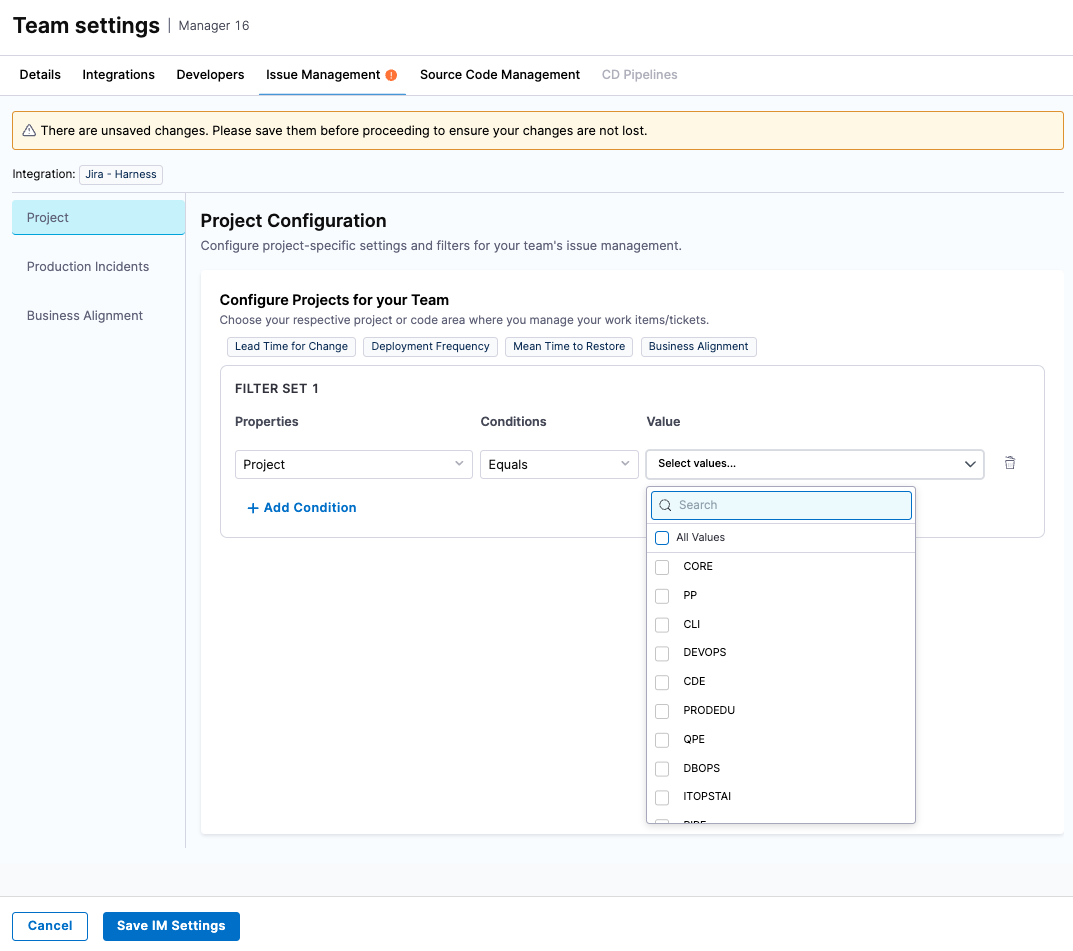 Business Alignment categories (e.g., Strategic Work, Tech Debt, Customer Commitments) are centrally defined by the Harness SEI Admin in the profile and apply across the organization. Teams configure how to filter work items into these categories using their own logic.