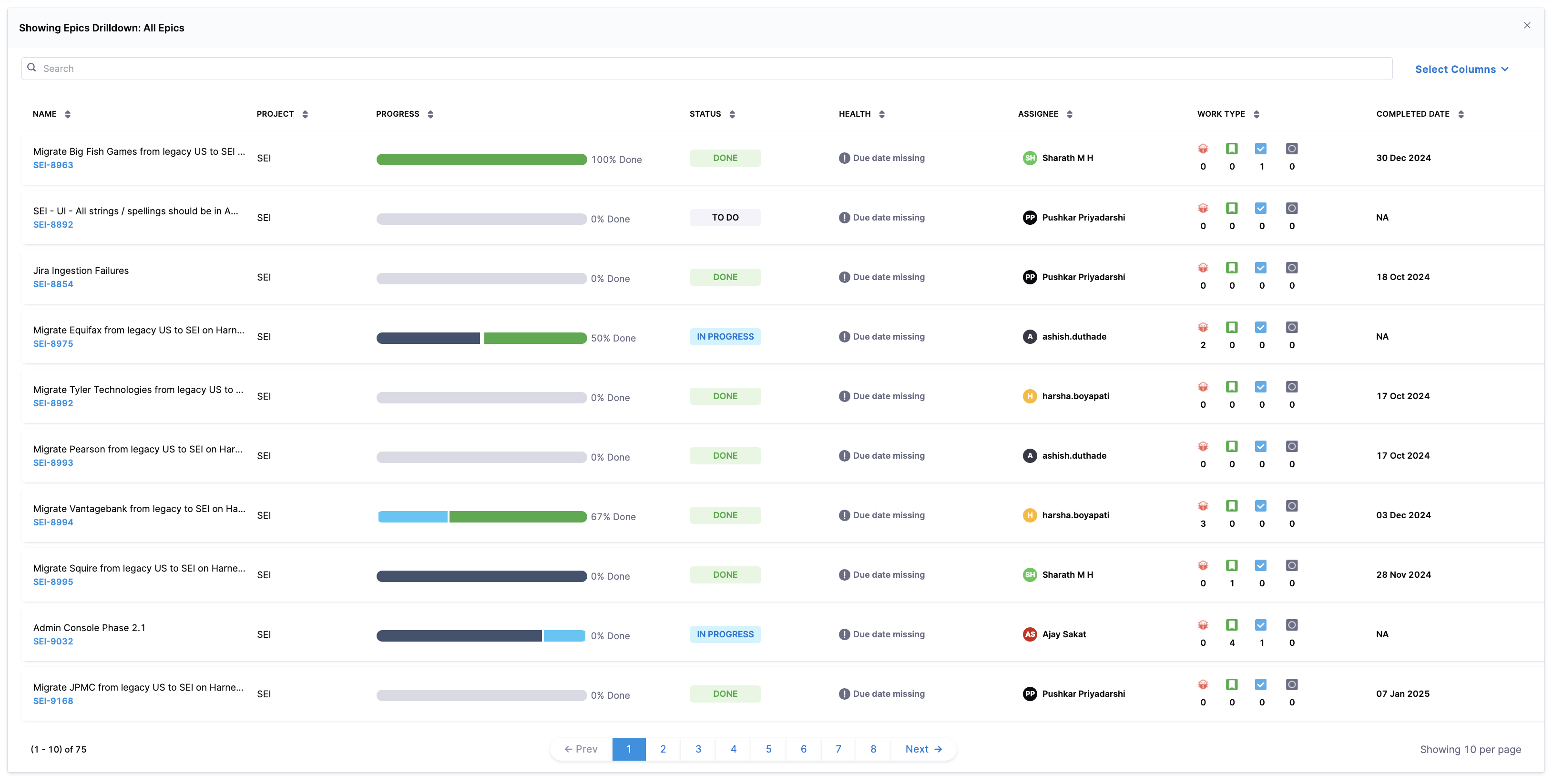 This view allows teams to deep-dive into epic progress, identify risks, and take action to maintain delivery efficiency.