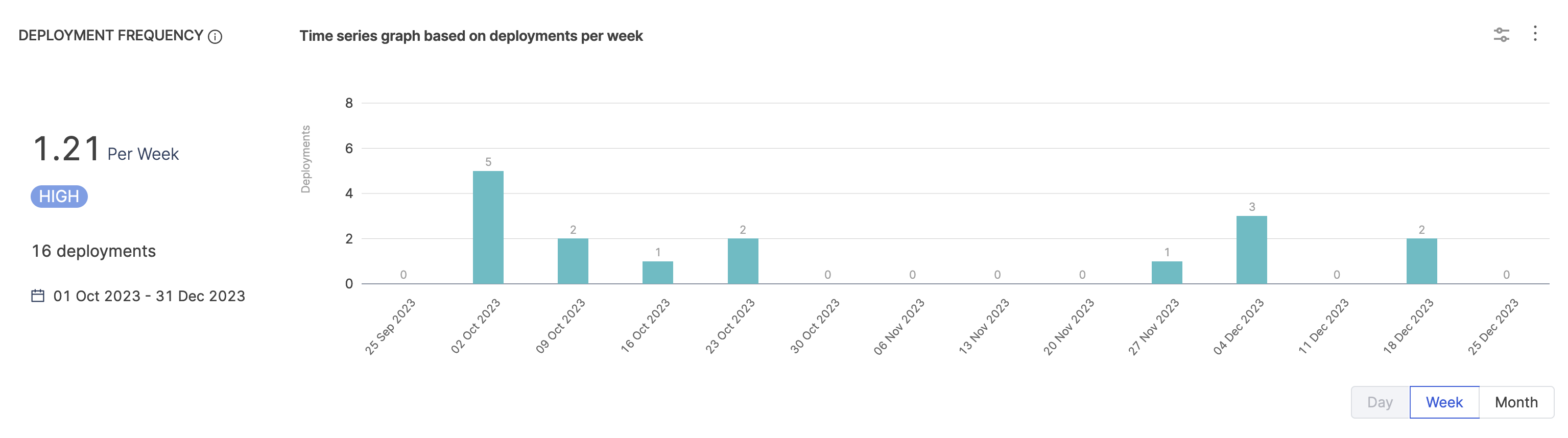 You can use a DORA Metrics Insight to examine your organization's DORA metrics. This helps you understand how your organization or team is performing and helps you get an overview of daily, weekly, and monthly trends.